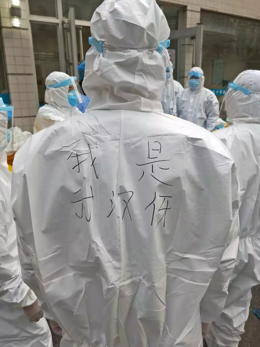 江汉城管的一位职工在防护服上写下“我是武汉伢”。受访者供图