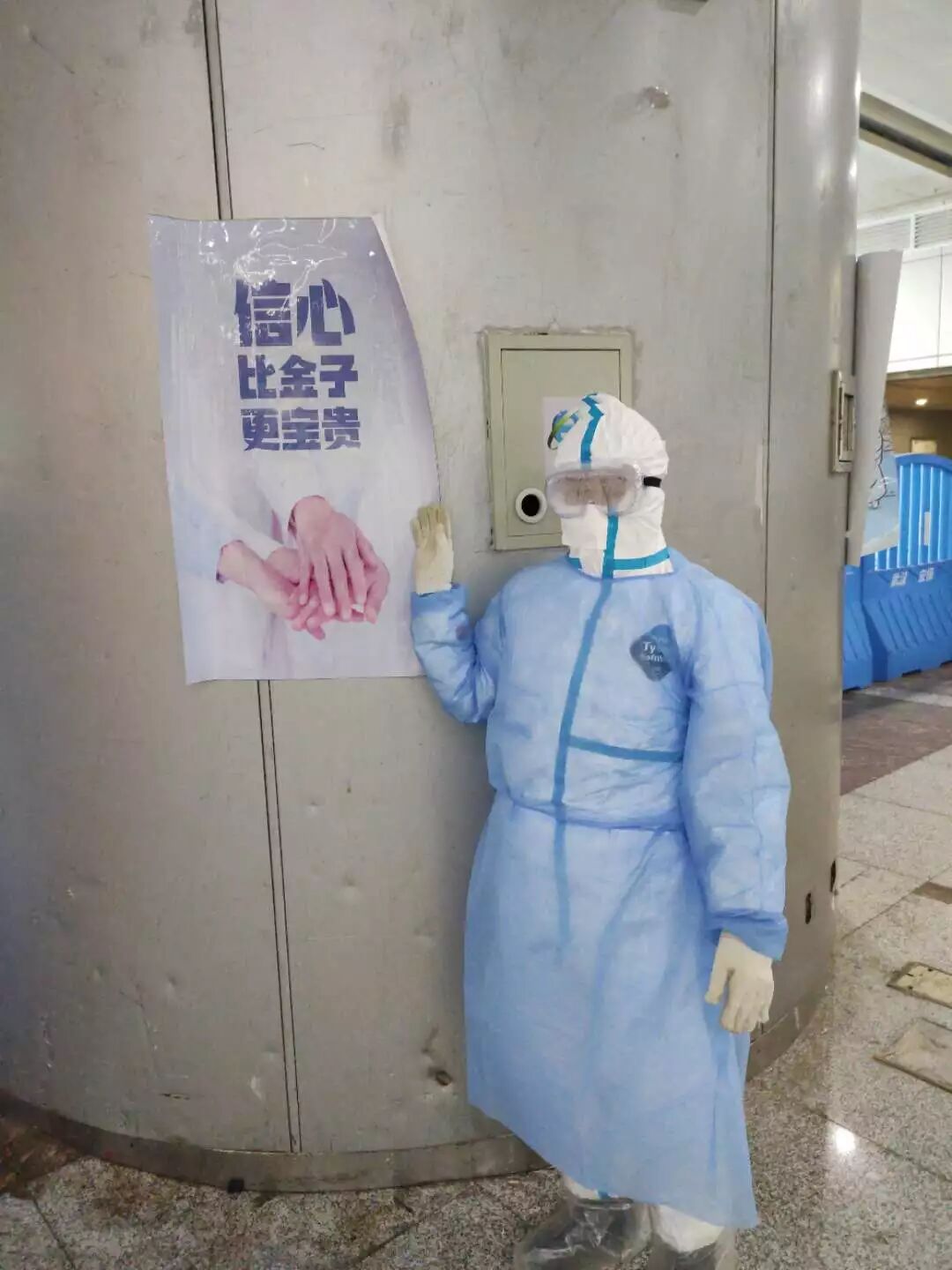李佳在方舱医院的抗疫海报前留了张工作照。受访者供图