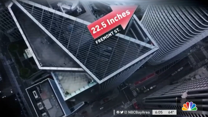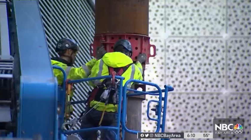 将52根桩子钻入250英尺(635cm)深的基岩,以支撑当时西北方向倾斜17英寸(43cm)的建筑。2英尺厚的圆形钢桩内用钢筋混凝土填充。其中22个桩将沿Mission街打入,30个桩将在Fremont街打入。然而,该项 "周边桩基升级 "的修复计划,却在开工几周后就立刻停止了。原来,工程开始之前,大楼西北向已经倾斜约17英寸(43cm),而修复开始后,大楼又迅速倾斜了2英寸(5cm),这无疑是雪上加霜的一次修复行动。![]()