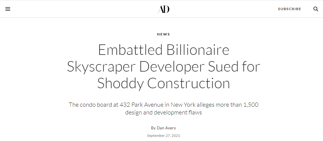 居民们表示这栋建筑的结构缺陷”使他们的生活成为一场噩梦“。2016年,Sarina Abramovich和丈夫以1700万美元的价格买下一个住宅单位,然后入住两年多后,严重的漏水渗水问题让他们遭受了50万美元的损失。不仅是他们一家,2018年,仅漏水事件就发生两起,更糟糕的是,“水管故障”导致电梯井道进了水,使四台住宅电梯中的两台停运了数周。作为超高建筑专业户,建筑设计师Rafael Viñoly别出心裁地从一个垃圾桶汲取了公园大道432号的设计灵感。也许正是这一灵感,让几年后住户们无法忍受“墙壁之间的金属隔板嘎吱作响”,“将垃圾扔进垃圾道的声音,听起来像炸弹”。“划桨船一样吱吱作响的墙壁”严重影响了居民休息,“风吹入门口和电梯井道中发出幽灵般的哨声。”公园大道432号的公寓委员会声称,这座俯瞰中央公园的96层摩天大楼仅在公共区域就 "布满 "了1500多处建筑和设计缺陷,其中许多被描述为 "生命安全问题"。不仅如此,工程公司还发现,设备中有1/4存在生命安全隐患。