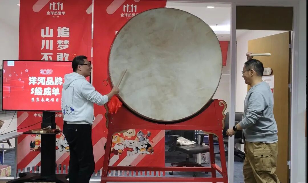 春晚项目组成员击鼓庆祝品牌加入春晚合作
