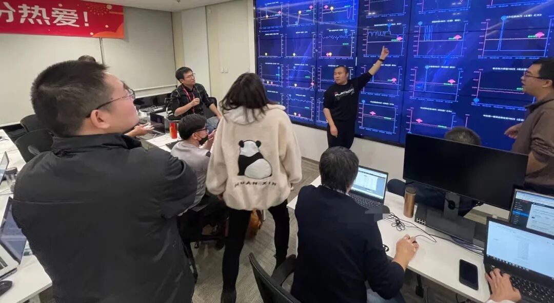 压力测试屏幕前,来自不同部门的工作人员正在讨论