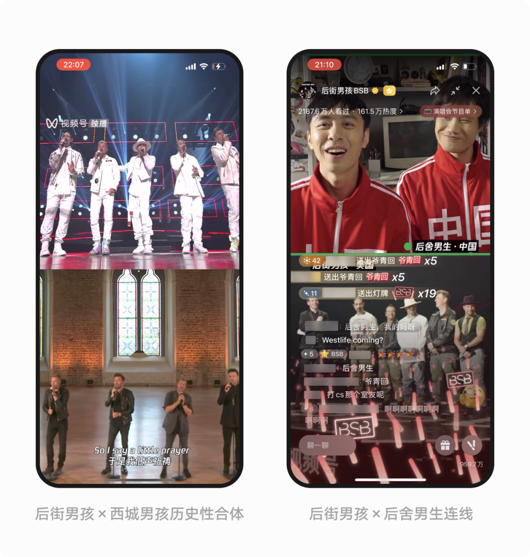 演唱会中还特别策划了西城男孩连线环节,两大传奇男团首度同台,将情怀拉满,引爆社交话题,除此之外还有后舍男生连线、粉丝祝福 VCR 等环节,沉浸式的用户体验和直击用户情感的内容策划都大大激发用户分享意愿,引发更广泛的情绪共鸣。后街男孩演唱会直播间分享次数达 160 万次,带动冠名品牌破圈。