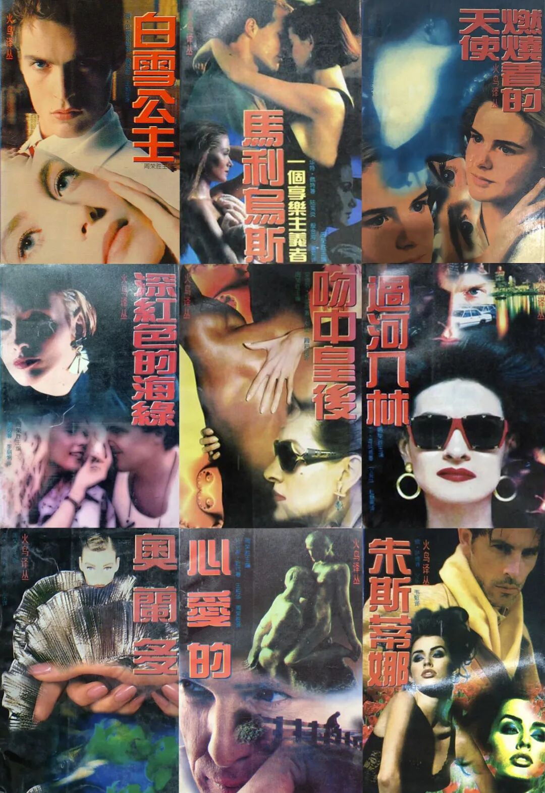 分别出版于1997和1998年的《麦田里的守望者》人像荟萃风格的封面大多集中在90年代,随着改革开放的大浪翻滚,电脑P图技术终于悄然踏入国门并受到追捧,设计师(当时可能更多地称为美编或美工)想必是摩拳擦掌跃跃欲试,展示这项新兴技能,才能彰显自己站在了时代的风口浪尖。实话实说,第一本忧郁少年的凝视我还是能接受的,这一本在我上学时的图书馆也是必备图书;但第二个小哥哥的胸肌就有点让人羞涩了。然而,当我在50个不同版本《麦田里的守望者》封面里看到这本广州出版社2007年的版本时,深深地怀疑自己看错了年份。凸显经典气质的烫银纹饰中镶嵌着90年代遗风的照片(也可能是油画),却在21世纪来到了我们面前。直到看到同系列的盖茨比,大概编辑和设计师想要的就是内味儿吧。其实前面的几个都只是PS入门级水平,1994年由哈尔滨出版社出版的“火鸟译丛”才真正从难度和表现力上挑战了视觉。该系列共9本,包括《白雪公主》《马利乌斯》《燃烧着的天使》《深红色的海绿》《吻中皇后》,以及四位大作家不太为人知的作品:海明威《过河入林》、伍尔夫《奥兰多》、萨德《朱斯蒂娜》、哈代《心爱的》。每个封面都至少有3个图像或人物拼贴而成,边缘虚化巧妙融合。虽然细节处仍显简陋,比如一丛灌木戳到了《心爱的》这位男士的鼻子上,但,who cares?看着这些目光交错满满电影感的封面,仿佛误入了90年代的租碟店,让人想伸手又羞怯,想离开又挪不动脚。不管好不好、美不美、是不是符合书的内容,这批人像荟萃的封面,确实牢牢抓住了一个设计小妙招:用眼神抓住你。在人像荟萃这一风格之下,有一个不容忽视的风格流派,大胆试探着读者的视觉边界。