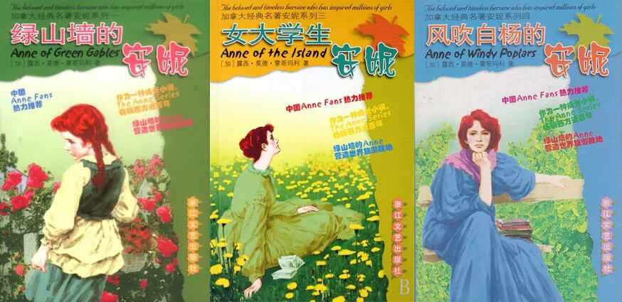 这一版安妮系列的封面插画倒没什么毛病,豆瓣评论区甚至有人询问插画作者是谁,问题在于设计排版过于花哨,除了层次复杂字体多变的中英文书名、丛书名,广告语就像小吃街的霓虹灯,让读者眼花缭乱。看完这些封面,我不得不转向手边摆放的图书洗洗眼睛。