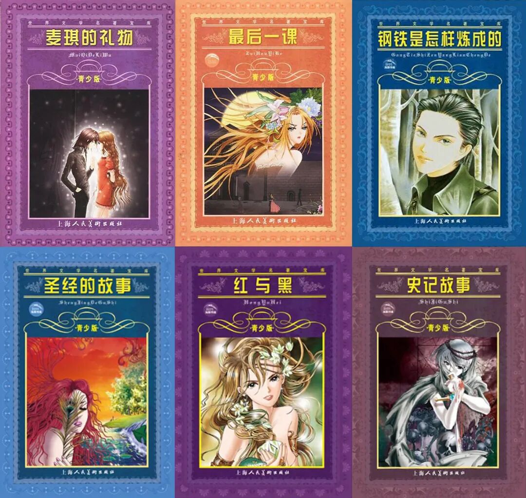 大山诚一郎的两部推理,封面不约而同地用了惊恐的眼睛,与它们对视30秒后,我需要看些美好的东西洗洗眼睛,比如《绝对不在场证明》的原版封面,竟如此清新宜人!可能只有鼓起勇气看过书之后,才能判断是哪个封面骗了我。上面这个封面可能让人觉得,只要有一张好看的插画,封面就能吸引人,事实是,too young too simple.图书市场上从来不缺“文学名著宝库”,但真正经典的却不多。这套坚持出了十多年的青少版名著宝库,在经典纹饰里嵌套日系漫画(可能是套系书的经典套路),明显是为了迎合少男少女的喜好,却偏离了原作的内容和设定。