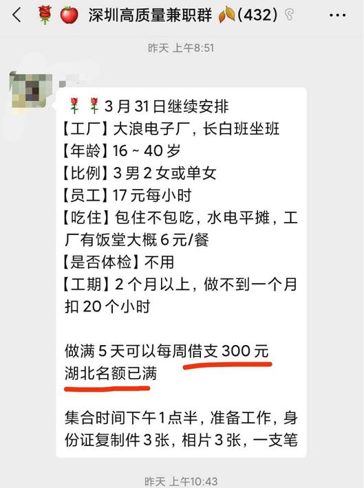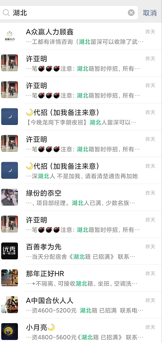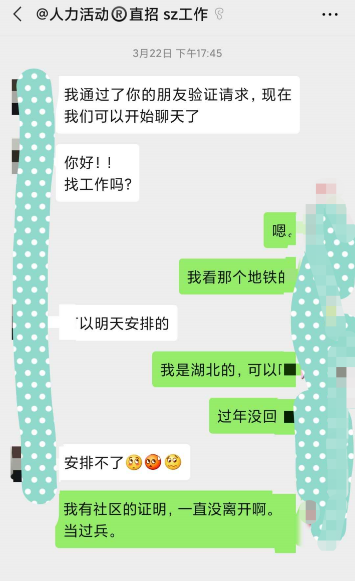然而即使在如此缺人的情况下,中小工厂对待湖北籍工人的态度却出奇一致:拒接、勿扰、湖北名额已满,没有任何商量的余地。以深圳为例,只有少数日结零工和不需要坐班的工作会招收春节期间留深的湖北籍工人,这对数量庞大的湖北籍返岗务工人数来说是杯水车薪。