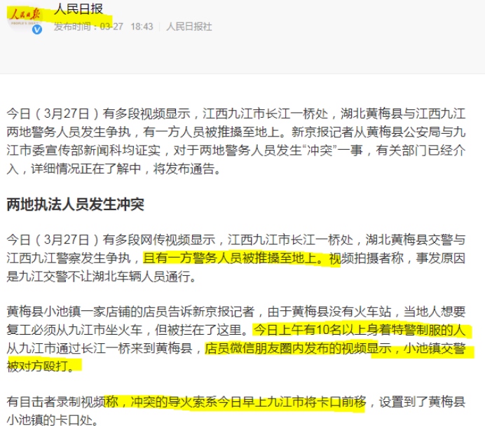 对湖北人来说,困难的不仅是出省后难找工作,甚至出省本身,也成了一大考验。湖北黄梅县与江西九江市一江之隔,素有“一座九江城,半城黄梅人”之称。黄梅没有火车站,当地人想要复工必须从九江市坐火车,27日早晨九江市警方将卡口前移以限制黄梅人过桥,黄梅警方上前要求撤卡却遭到九江特警殴打。(当然,新京报在文末也说“对于九江市执法人员是否殴打黄梅县执法人员九江市委宣传部新闻科工作人员称真实情况与网传情况有所出入过程细节仍在了解中”不知五天过去了了解的怎么样了。)