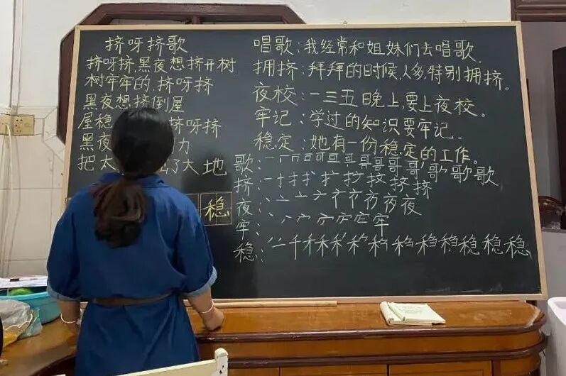 6月15日这天,她要教大家歌、挤、夜、牢、稳这五个生字,那五个生字来自于小学课本《日有所诵》中的一首童谣《挤呀挤歌》:“黑夜想挤开树,树牢牢的……黑夜想挤倒屋,屋稳稳的……黑夜因为太用力,把太阳挤出了大地。”课晚上八点开始,下午四点半她就把这首童谣抄到黑板上,然后拍了照片发到群里,很快有同事指出,“牢”字的第二道横太短了,她又赶紧擦掉重写。