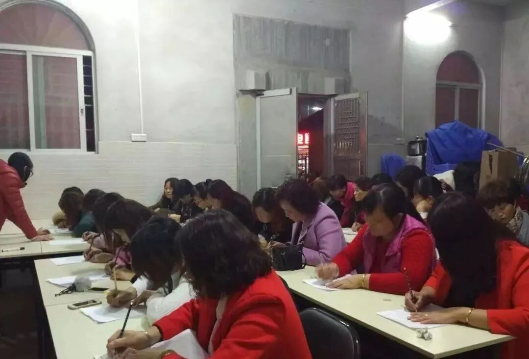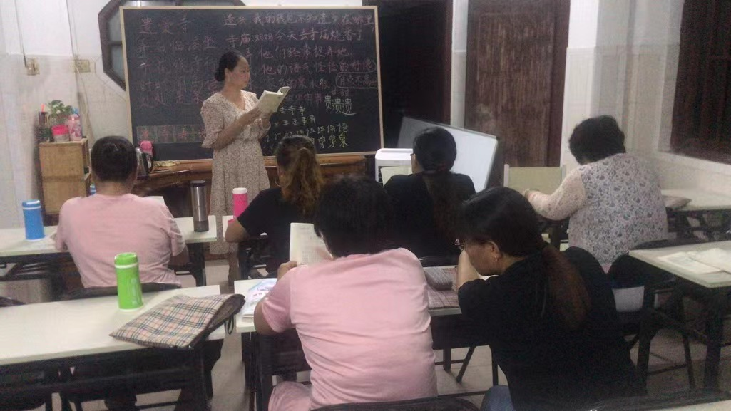 吴利珠一开始请来上课的,是当地小学的四位语文老师,张泽双是其中之一。她记得,刚开班时场面非常盛大,有将近50个学员,还要分成两个班。最开始,每周有五节课,每天从晚八点上到九点半。每个学员一个月要交200块的学费,用于支付老师们的讲课费。有一位70多岁的母亲帮40岁的女儿交了学费,说希望弥补早年没让女儿读书的愧疚。还有一位60多岁的老人,带着两个孙子来上课。