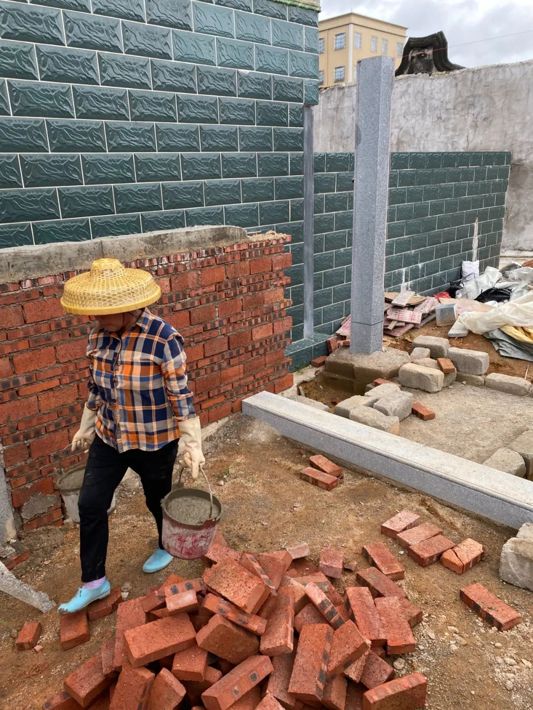 每天早晚6点,她准时去镇上一家机构做清洁工。其余时间,她在村里一处正在修建的家祠做力工,那是工地上技术含量最低、也最累的工种,她戴着橡胶手套在烈日下搬砖头、和水泥、不断把30多斤重的砂浆桶举过头顶,递给高处的工友……即便对于壮年男性,这都是一份沉重的体力劳动,但53岁的林赛竹看上去习以为常,一次能稳稳拎起两桶砂浆。近10小时的劳作后,她能赚120块钱。