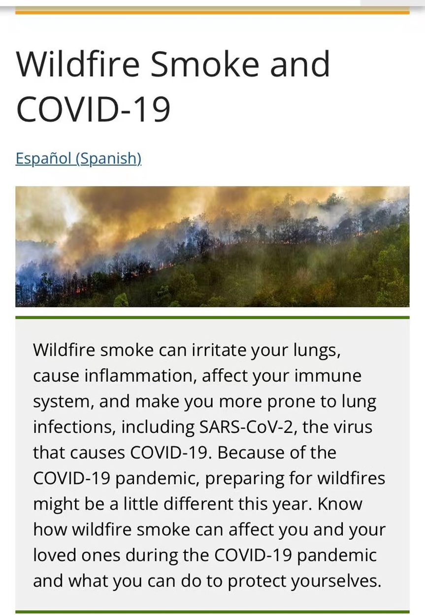 目前患有新冠病毒的人还面临着因野火烟雾而增加的健康问题风险,例如咳嗽、呼吸困难或心脏病发作。