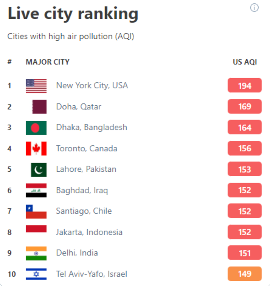 纽约连续三天成为全球空气污染最差的城市