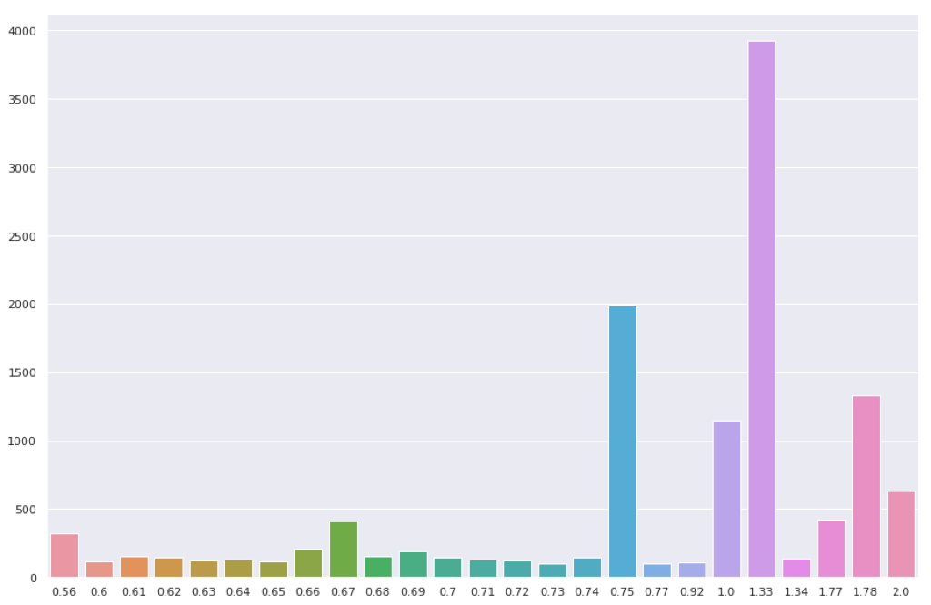图片长宽比有一定的差异性,下图是h/w比例数据分布图(只显示该类数量大于100的比例),长宽比大多数集中于1,后来模型输入尺寸设为1:1