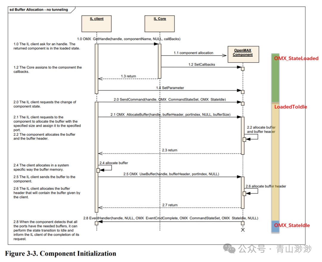 - IL Client调用 OMX_GetHandle 方法创建组件,组件所有的配置与资源都被初始化,进入StateLoaded状态。IL Core调用组件的SetCallbacks方法将回调函数注册到OMX组件当中。组件创建成功,OMX_GetHandle将组件句柄返回给IL Client。
