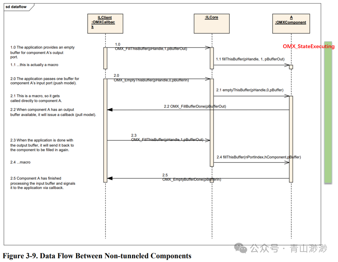 收到组件StateIdle状态设定完成发送的callback后,IL Client会调用OMX_SendCommand再向OMX组件发送CommandStateSet命令,请求组件将状态转换为OMX_StateExecuting,组件收到此请求不需要执行一些复杂动作(时序图没有标出这个流程),状态设置完成后组件同样会发送callback给IL Client。