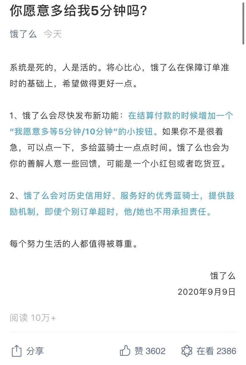 外卖平台饿了么的公号赶紧发了一个文案,《你愿意多给我5分钟吗?》,呼吁消费者更用心等待,公司会尽快开发一个“我愿意多等5分钟”。这个表态多少有点温情。至少公号后台放出的评论,大家都感动得一塌糊涂。