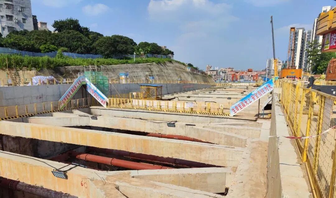 大朗西站总长471米,为地下两层局部三层岛式换乘车站,采用明挖法(局部盖挖)施工,西段处于大朗镇TID开发地块,东段位于松佛路上,受此影响车站基坑采用分段分期施工,大朗西站一期主体结构已于2021年9月30日封顶。