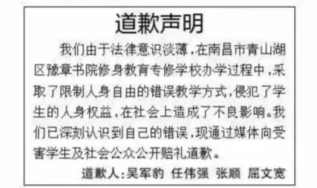 而被告人吴军豹、任伟强、张顺、屈文宽则在《新法治报》4月25日第06版刊登道歉声明,声明中称,他们由于法律意识淡薄,在南昌市青山湖区豫章书院修身教育专修学校办学过程中,采取了限制人身自由的错误教学方式,侵犯了学生的人身权益,在社会上造成不良影响。