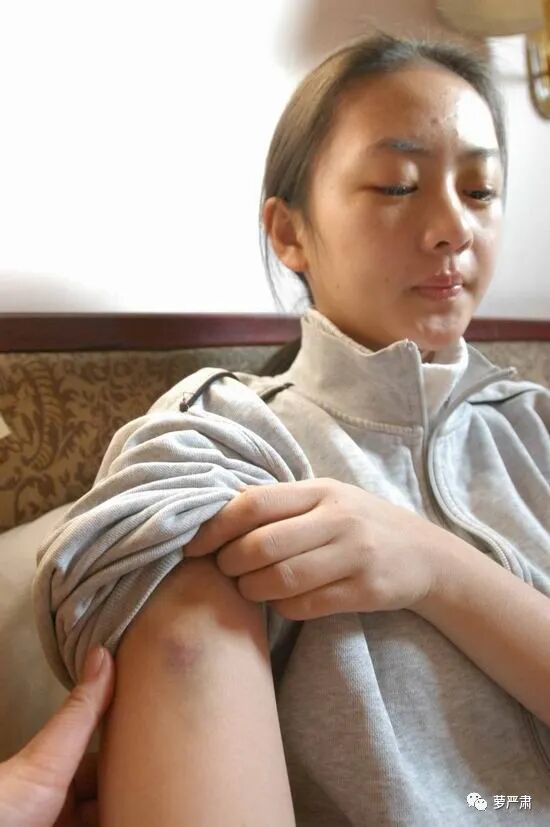 记者看到,童瑶的双眼睑至今血红且眼眶淤青,左眼外侧的白眼仁明显留有血痕,此外鼻骨微肿,双肘及双膝均有手掌大小的淤青未退……记者问童瑶现在感觉怎样,半躺在床上的她说道:“我现在右眼看着你都模糊,而且经常头晕头疼,还有脸部肌肉要是动的话,会牵扯着鼻子疼,再有就是腰也经常疼。”在长达近一个半小时的采访过程中,记者确实发现童瑶会时不时下意识地用右手扶一下右腰……