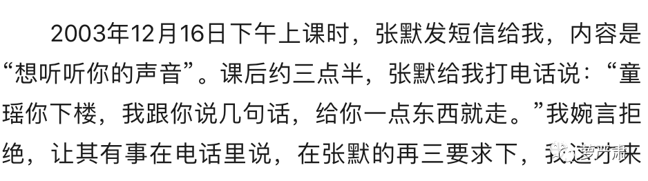 根据童瑶口述,2003年12月16日下午上课时,张默发短信给她,内容是“想听听你的声音”。下课后,张默给童瑶打电话说:“童瑶你下楼,我跟你说几句话,给你一点东西就走。”
