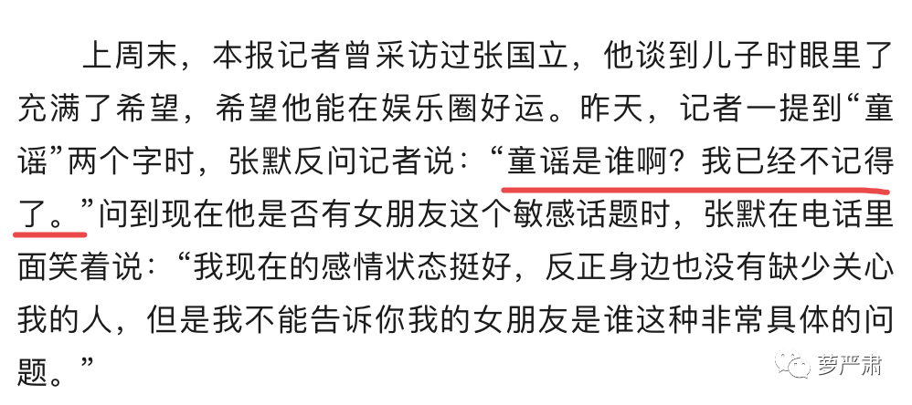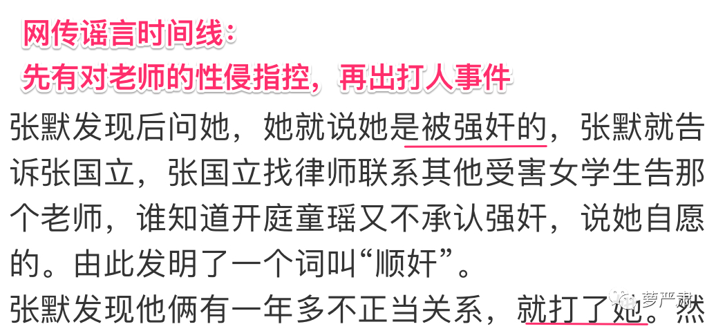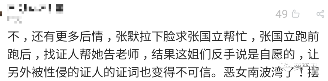 网传谣言里,张默是一个悲催的孩子,知道女友被性侵,“拉下脸”来找张国立帮忙,张国立“跑前跑后”,童瑶“反手说是自愿的”。