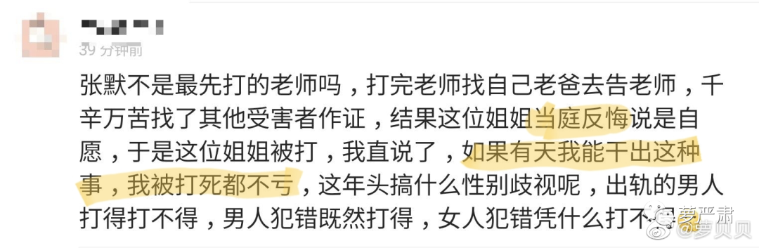 在拆解被殴打者有错的过程里,那句“打人不对”的免责声明没有任何意义。因为铺天盖地传播的,不是张默怎么打人、打了多长时间、造成了如何严重的损伤;而是童瑶是怎么样一个坏人,哪些哪些错了,导致张默打人——这不就是传说中的“被打的女性也是情有可原的”?