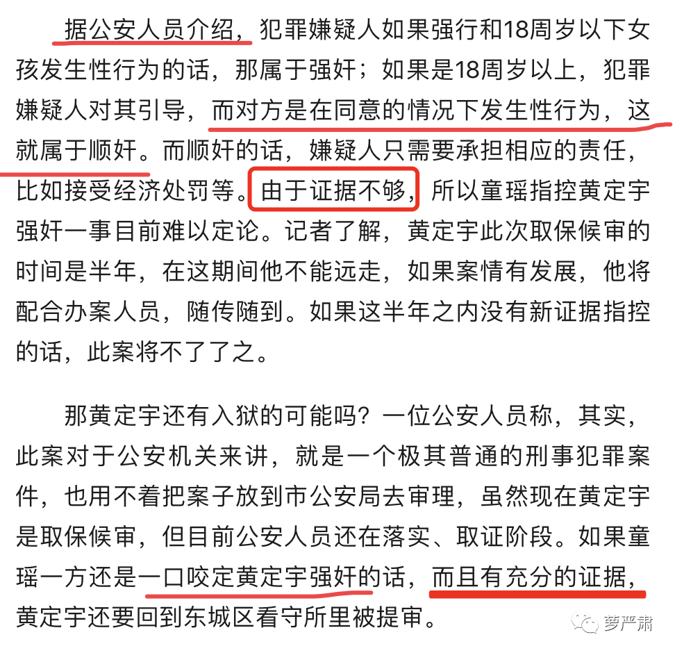 再来看当年报道,2004年2月,媒体报道黄定宇取保候审时提到了“顺奸”,引用的是公安人员介绍的定义,黄定宇性侵案难有定论的原因是“证据”不够,之后如果童瑶仍然坚持原有主张,也要有“充分的证据”,案件才能有进展。
