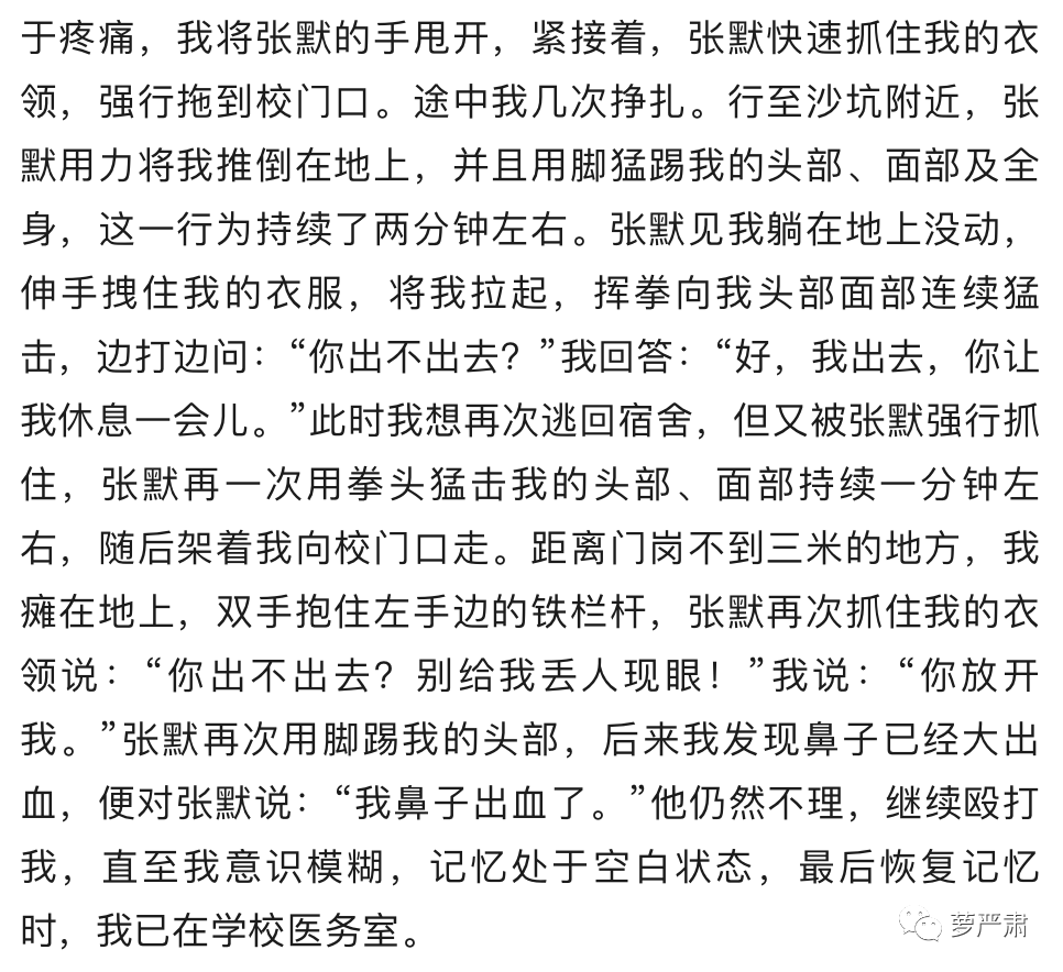 事件发生的起点是宿舍门口,张默走向童瑶时,边走边挽起衣袖,表情动作吓人,童瑶想借口上楼拿衣服离开,张默一把拽住她,当时女方已经感觉到疼痛,张默抓住女方的衣领,“拖行”到校门口。