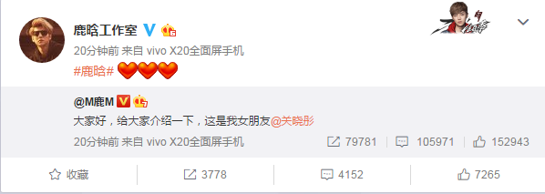 10月8日,鹿晗微博公布与关晓彤恋情。他写道:“大家好,给大家介绍一下,这是我女朋友关晓彤 ”