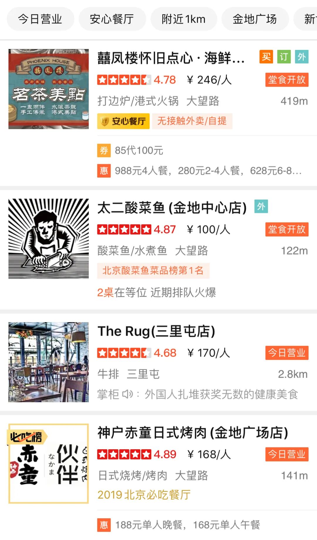 这个功能是在疫情后才上线的,通过“今日营业”标签,可以筛选出哪些餐饮店今天是营业的。而最近,大众点评又进一步在这个标签上细化了“堂食开放”的选项。