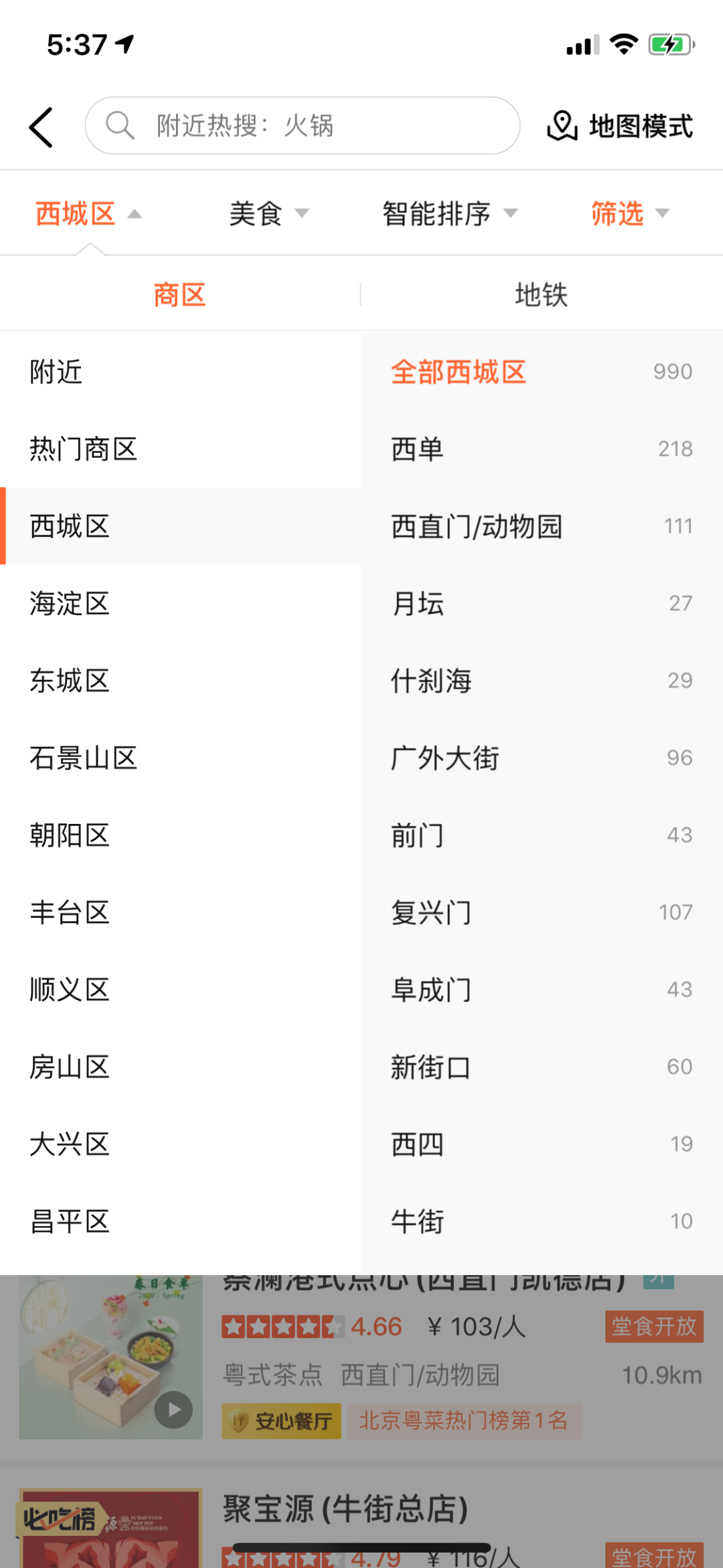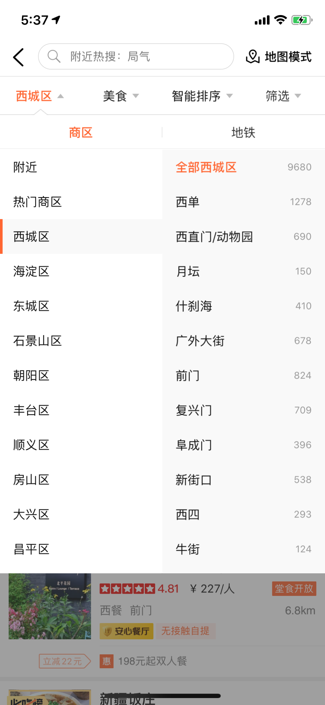 比如说西城区,截止4月15日,在大众点评上的餐厅总数是9680家,而标有“今日营业”的是990家,占比10%。