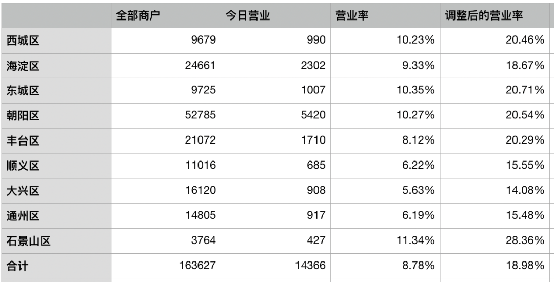 最低的大兴区,16120家餐饮商户中只有908家挂上了“今日营业“的招牌,占比5.6%。