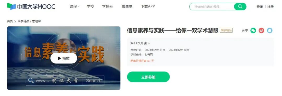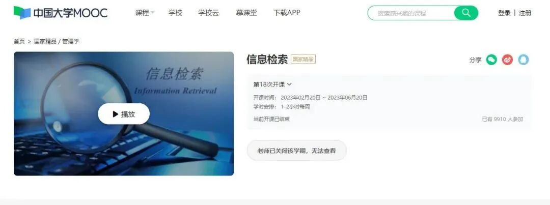作为近30万人选修,获国家精品在线开放课程、国家一流本科线上课程、国家一流本科线上线下相结合教程、全国大学生优秀素质教育通选课,入选学习强国和国家智慧教育平台的首批慕课,《信息检索》旨在培养学员的信息素养,即增强其信息意识、培养其在最短的时间内找到最相关的信息的能力,提高其利用信息检索解决生活、学习、工作与研究各方面问题的能力。