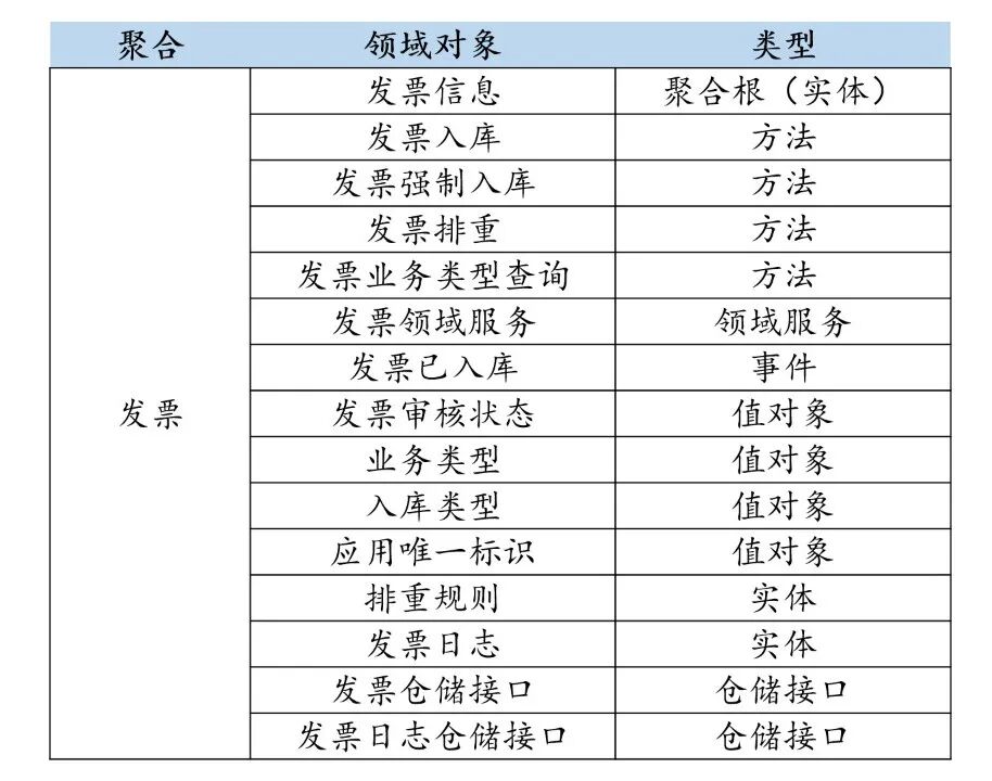 在战略设计阶段,因为发票总库的业务逻辑相对比较清晰,也有助于我们采用事件风暴的方式,快速的找出了聚合、领域对象、领域类型,为构建领域模型奠定了基础,以下是我们梳理完成的发票域的对象清单: