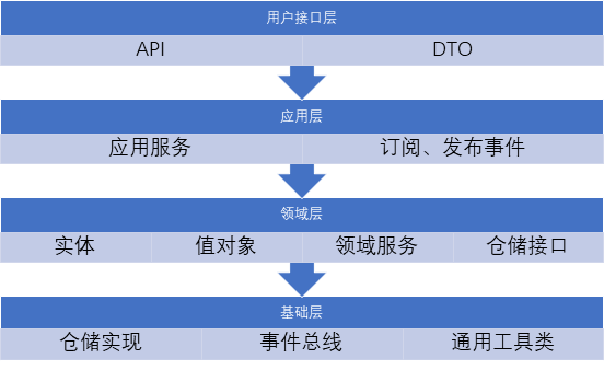 在战术设计阶段,我们完成了分层设计、规范设计等事项,在分层设计中我们遵循了DDD的四层分层模型,如下所示: