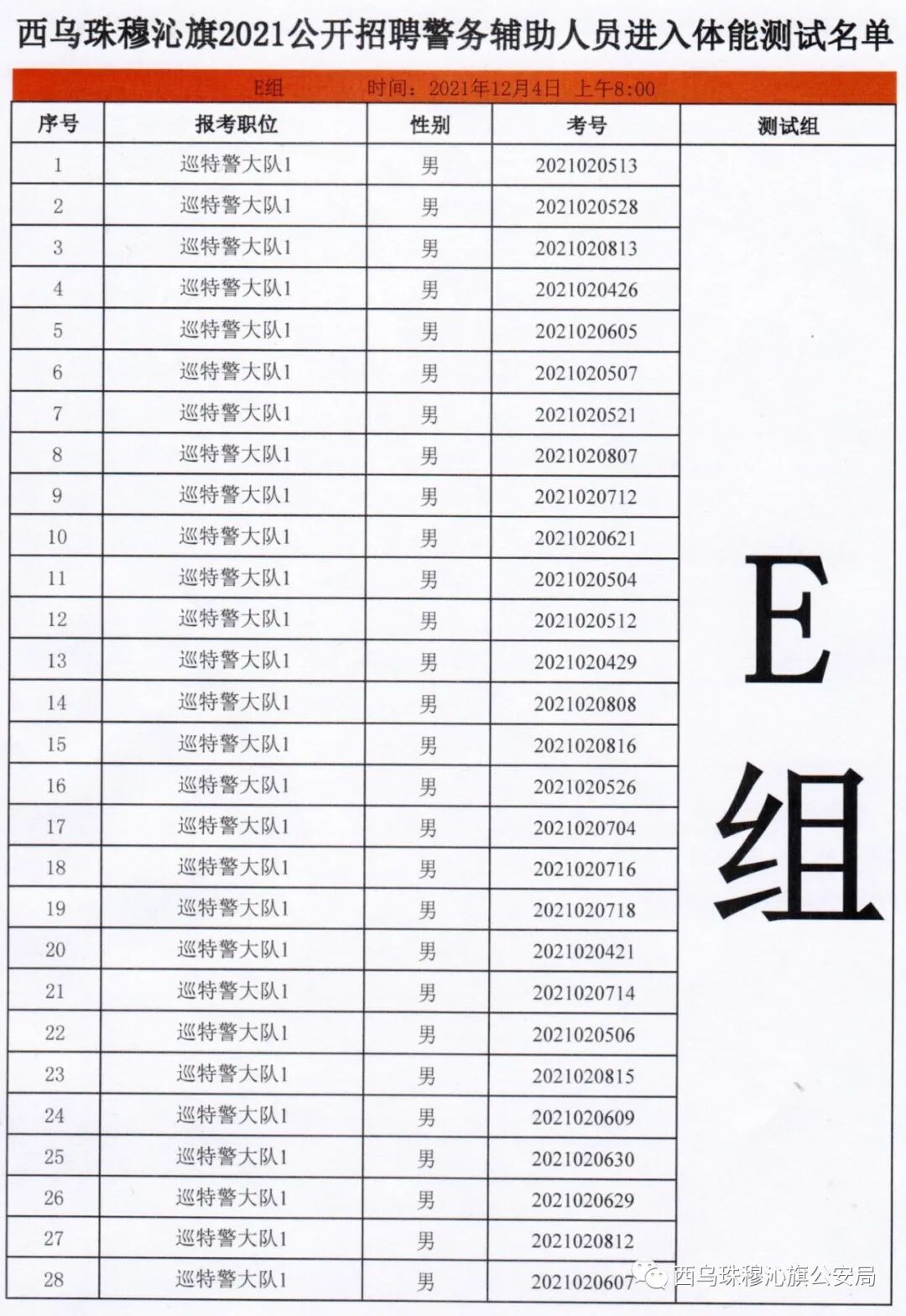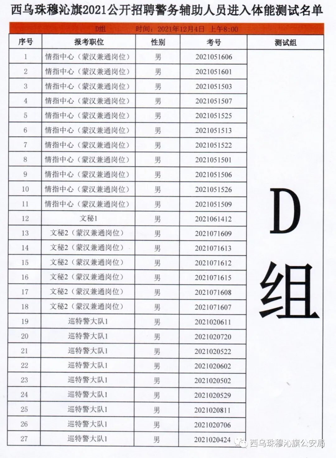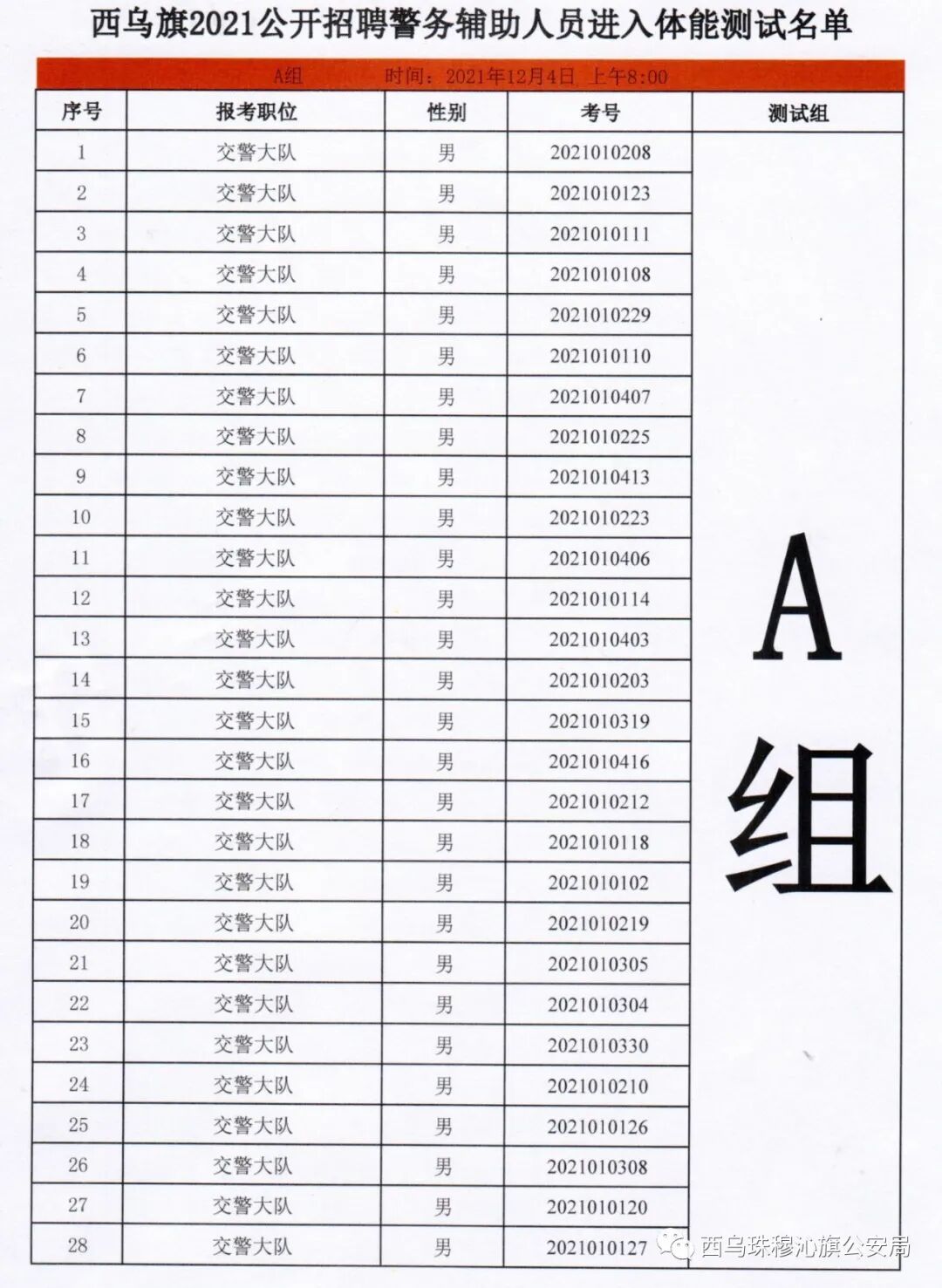 按照西乌珠穆沁旗2021公开招聘警务辅助人员招聘工作计划安排,前期,组织开展了考生资格复审工作,现将进入体能测试环节人员名单进行公示,并将体能测试相关事宜公告如下: