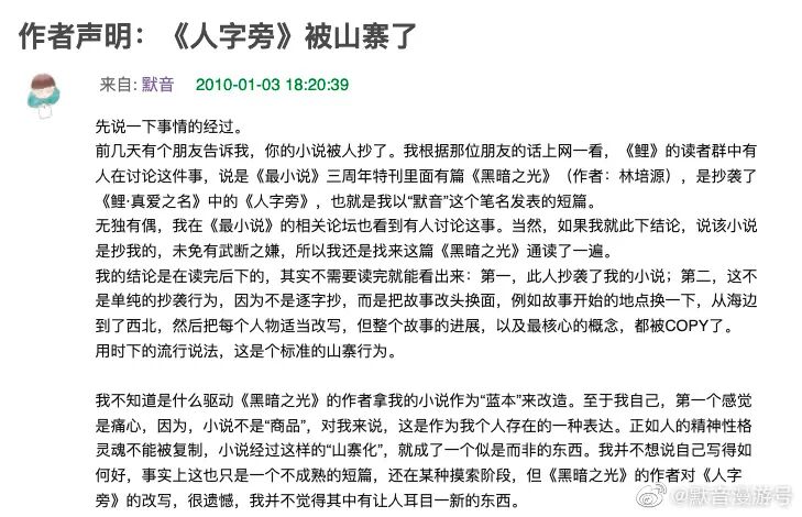 她在3月17日转发了12年前于鲤小组发布的《作者声明:〈人字旁〉被山寨了》,表示2009年12月《最小说·三周年特刊》中林培源的《黑暗之光》“山寨”了她同年8月在《鲤·因爱之名》上发表的《人字旁》,“读过后,我内心最大的冲击在于,这不仅是抄袭,更是拙劣的改写。”