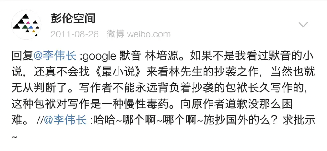 2011年时,出版人彭伦曾在微博上公开喊话:“写作者不能永远背负着抄袭的包袱长久写作的,这种包袱对写作是一种慢性毒药。向原作者道歉没那么困难。”