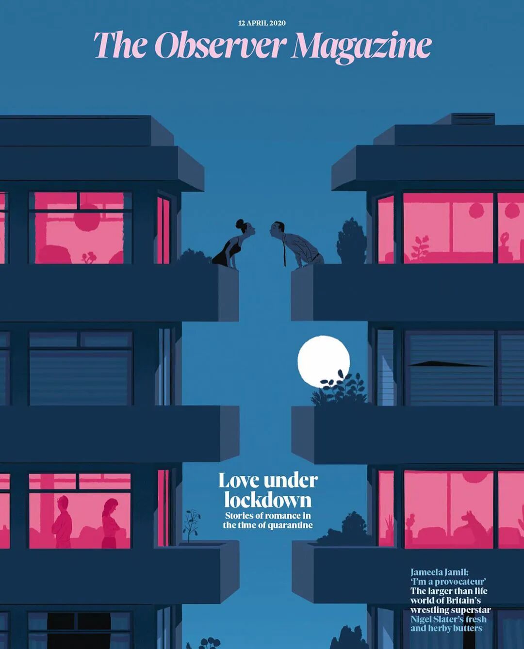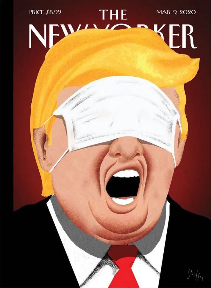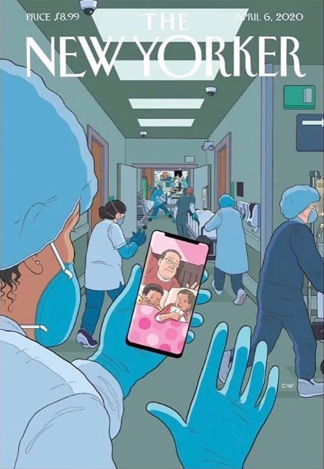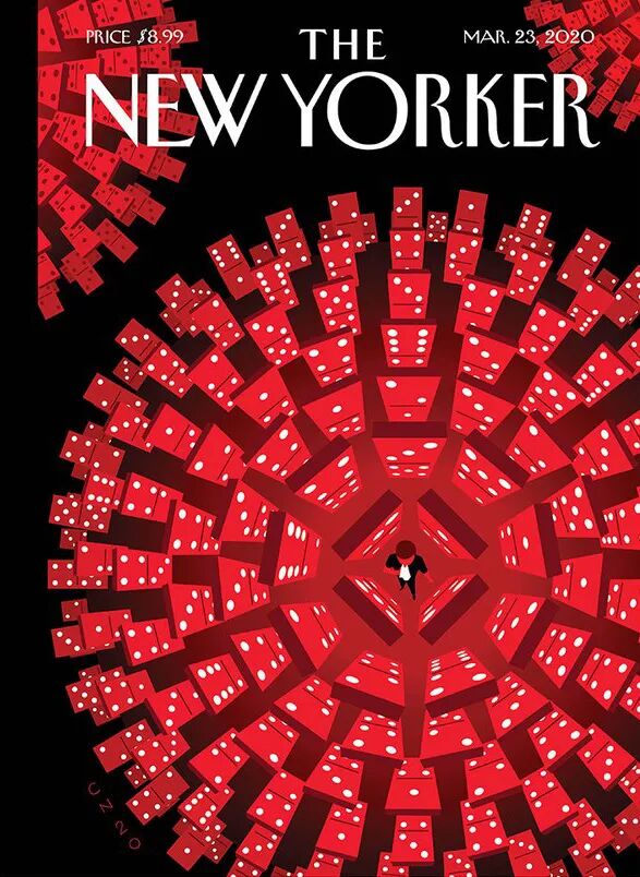 以插画封面闻名的《纽约客》杂志已连续多期关注疫情发展,从疫情早期的特朗普、以多米诺骨牌形象比喻疫情传播、空荡荡的公共空间,到近期广为传播的描绘医护人员与家人视频晚安的 Bedtime。