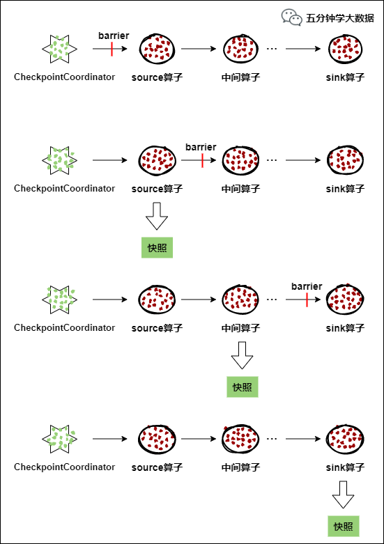 每个算子按照步骤3不断制作快照并向下游广播,直到最后barrier传递到sink算子,快照制作完成。