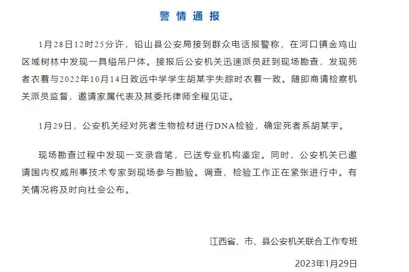 通报称“1月28日12时25分许,铅山县公安局接到群众电话报警称,在河口镇金鸡山区域树林中发现一具缢吊尸体。接报后公安机关迅速派员赶到现场勘查,发现死者衣着与2022年10月14日致远中学学生胡某宇失踪时衣着一致。”经DNA检验后确认死者为胡鑫宇,且现场发现录音笔。