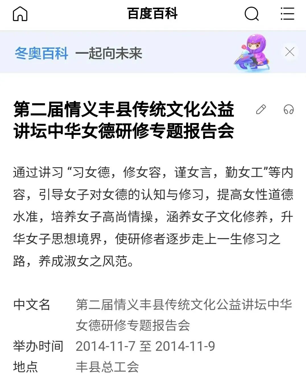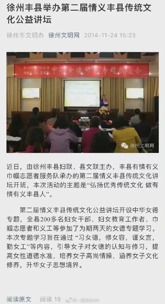 因为“铁链女”事件,网友挖出了丰县妇联办“女德班”的消息。当时一门心思关注拯救“铁链女”,没有太在意这条消息。这两天再看这条消息,还是由徐州市文明办的徐州文明网报道:由丰县妇联、文联举办“传统文化公义讲座”(实则就是举办“女德班”)时(2014年),当看到这个讲座的女德读本竟然是《女诫》(班昭)时,我简直不敢相信自己的眼睛,我简直是颤栗了!
