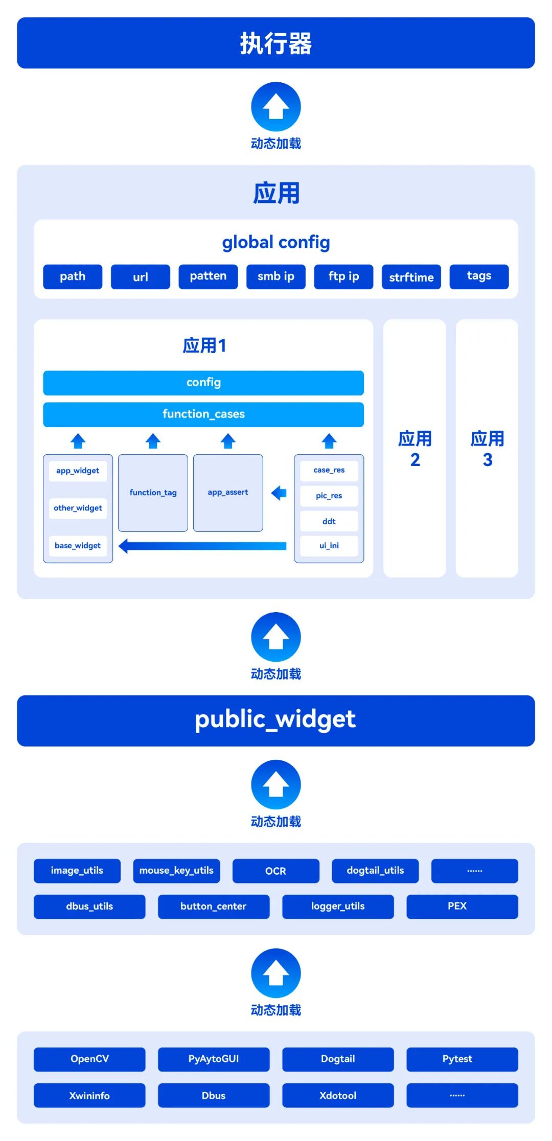 核心封装层提供基础能力,业务层根据实际业务需求(测试用例)动态加载核心封装层,执行层加载相应的用例集并控制执行流程。测试平台可以根据实际测试策略组装配置,通过执行层接口驱动框架完成自动化测试执行。