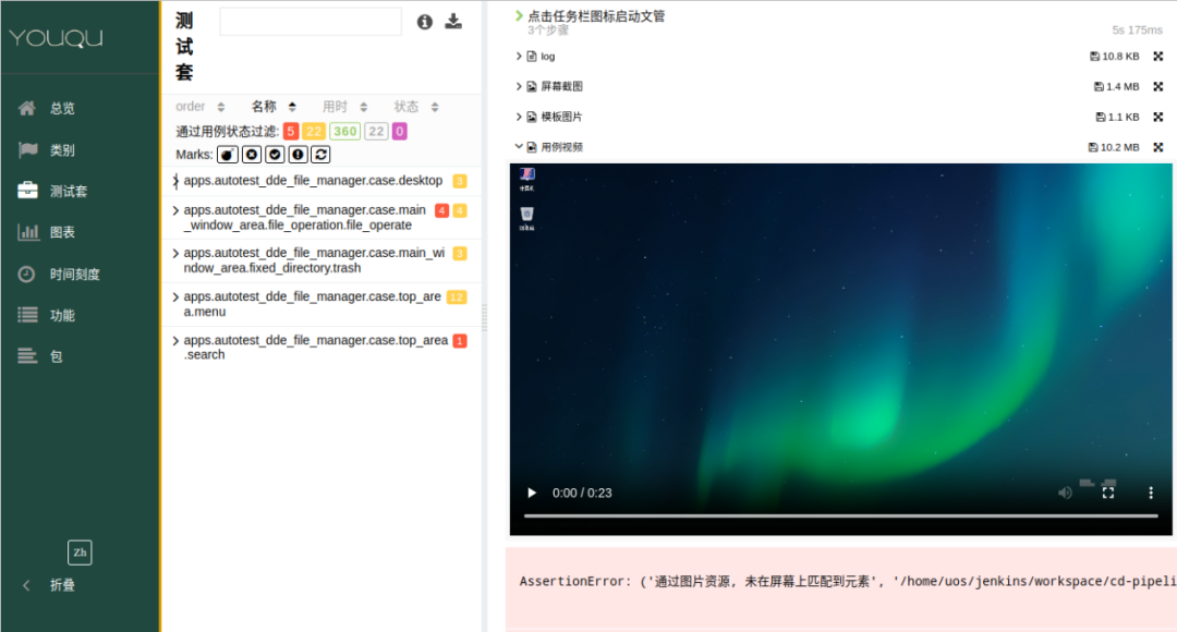 YouQu:内置全自动日志系统,能够自动记录并输出测试过程中的详细日志信息。同时,它还内置了执行失败录屏功能,且还能生成详细、美观且易于理解的测试报告。