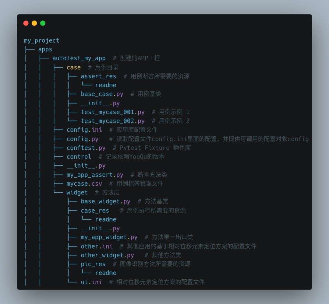 YouQu:内置脚手架工具,实现了一键创建完整的用例工程。在此过程中,导入语句、方法调用、公共方法等基础代码均能自动生成,大大降低了入门门槛,尤其对新手用户极为友好。这不仅加速了自动化项目的启动速度,还为后续的自动化脚本编写带来了极大的便利性。