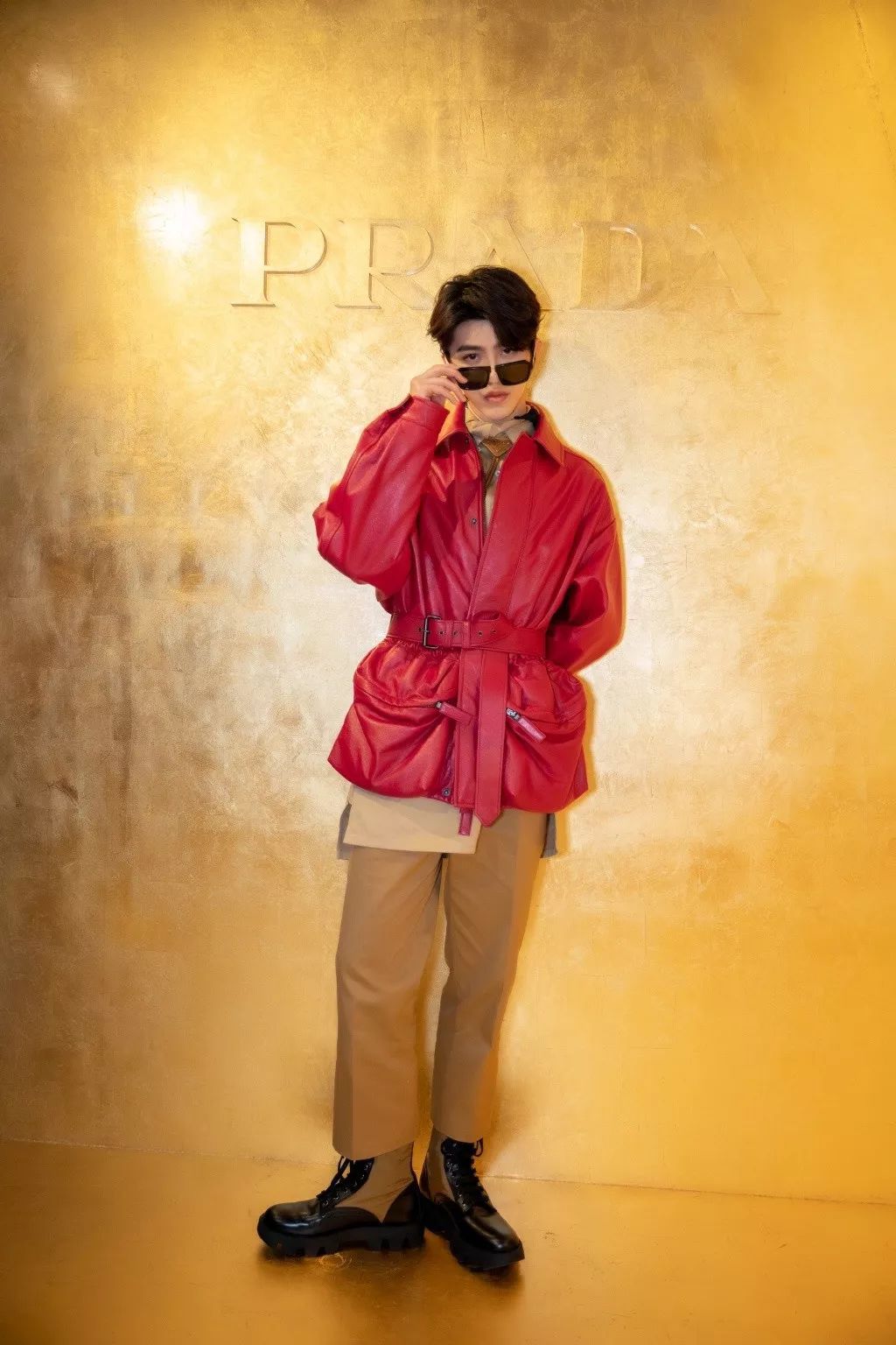 看秀当日身穿PRADA 2020 SS 系列红色中长款束腰外套,脚踩黑漆皮撞色尼龙拼接筒靴,挑不出毛病。之后的晚宴,黑色西服套装搭配白色T恤也中规中矩。