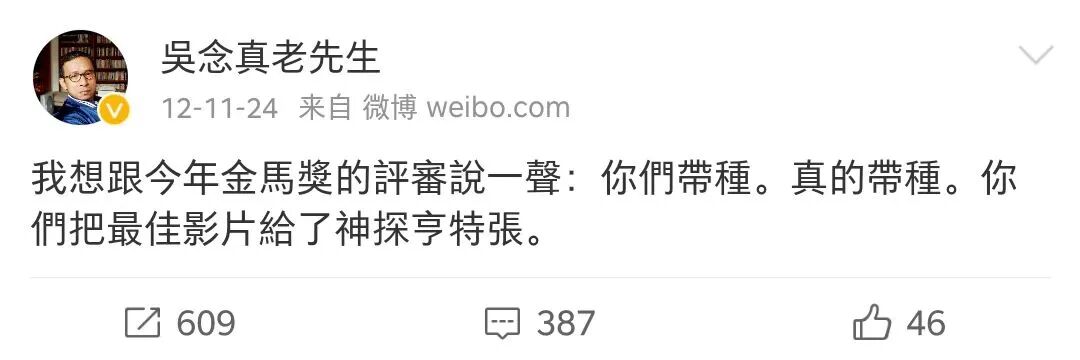 “你们带种,真的带种,你们把最佳影片给了《神探亨特张》。”