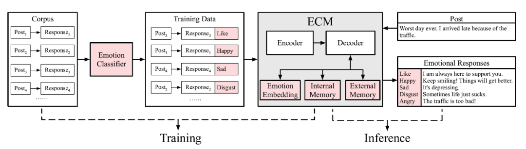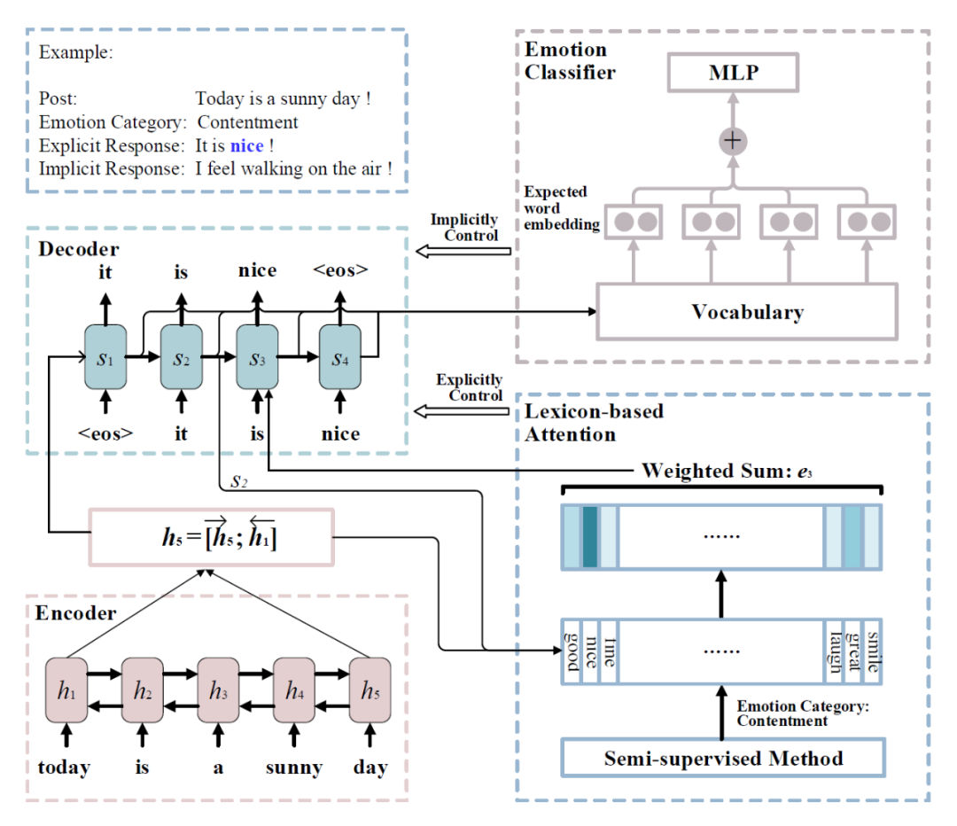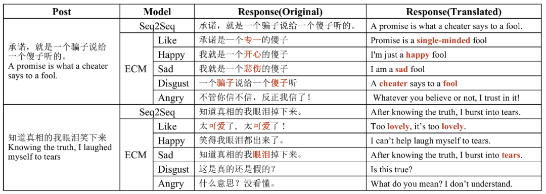 近期的一些工作表明[10, 13, 15,16, 18-21, 23],在人机对话系统中,除了回复内容之外,机器与人的情感交流也是一个重要问题。人类可以通过语言进行情感上的交流,获得情感上的慰藉,对话系统想要和人类进行有效的情感沟通,就必须具备一定的情感能力。具体来说,机器一方面需要对用户情感进行识别和判断,另一方面也需要在其回复中融入合适的情感。因此,如何在对话中赋予机器理解情感和表达情感的能力,是人机对话和情感分析领域面临的新的机遇和挑战。