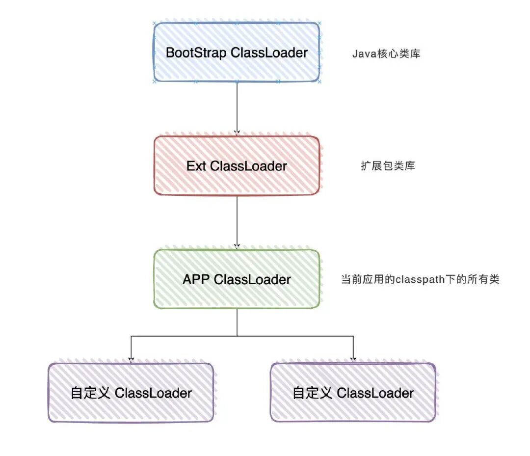 候选者:JDK 中的本地方法类一般由根加载器(Bootstrp loader)装载,JDK 中内部实现的扩展类一般由扩展加载器(ExtClassLoader )实现装载,而程序中的类文件则由系统加载器(AppClassLoader )实现装载。